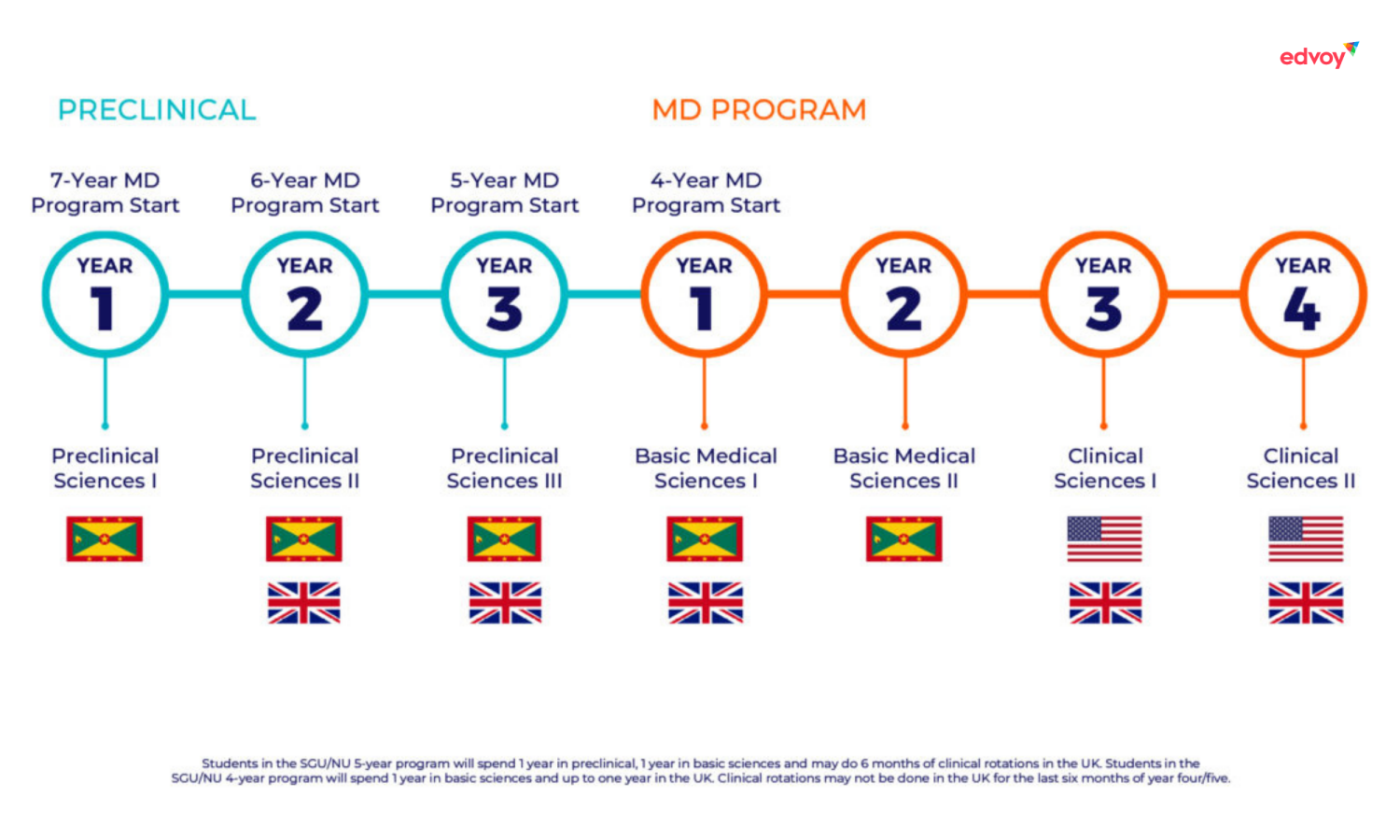 เส้นทางการเรียนแพทย์ MD ของ SGU ใช้เวลาประมาณ 5 – 6 ปี โดยนักเรียนสามารถเรียนต่อหมอในอังกฤษ Newcastle (UK) ได้สูงสุดประมาณ 3 ปี