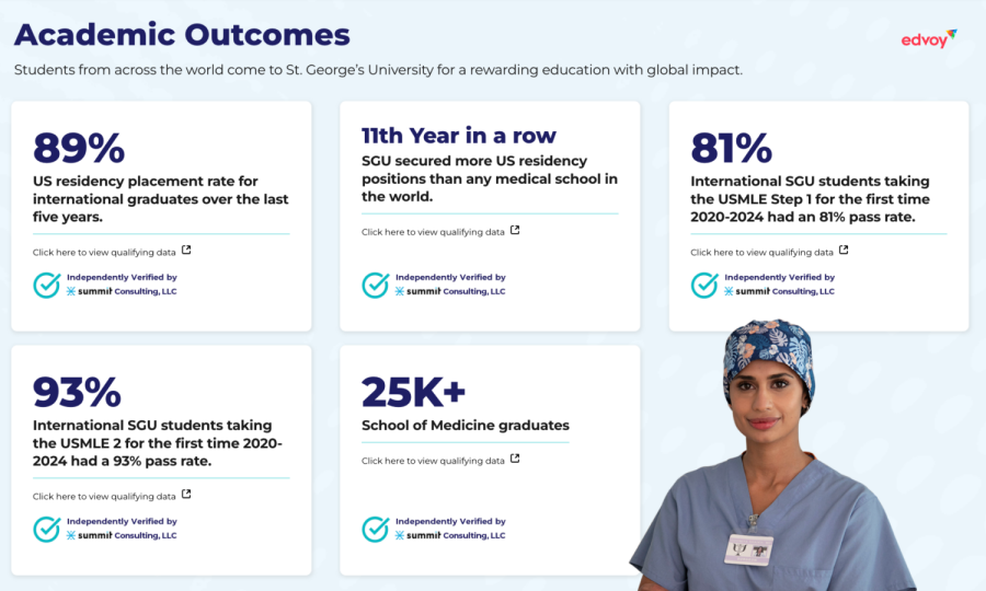 St. George’s University (SGU) เป็นโรงเรียนแพทย์ที่เปิดสอนหลักสูตร Doctor of Medicine (MD) ซึ่งได้รับการรับรอง และเปิดโอกาสให้นักศึกษาไปฝึกงานแพทย์ต่อใน สหรัฐอเมริกา และ สหราชอาณาจักร ได้